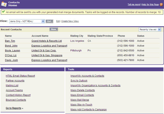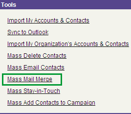 The next step in the process is to go to the tab (Lead, Account or Contact) from which you want to generate the mail merge. You pick the tab appropriate to your messaging. In this example I am going to use Contact information in my merge so I will start from that tab. Once on the Contacts tab I will scroll down to the "Tools" section and click the Mass Mail Merge link.