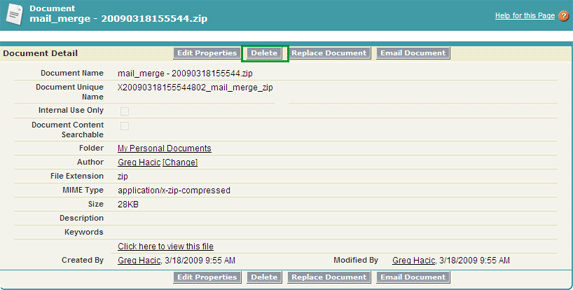 In a few minutes you will receive an email from Salesforce with a zip file containing all of the generated Word documents. The timing of this email will vary depending on the number of records included in your mail merge. Some companies put restrictions on the kind of attachments that can be accepted via email or the size of files that can be accepted. If your company does this then the file from Salesforce may be removed from the email. This is okay because during the setup of Extended Mail Merge we activated the setting "Always save Extended Mail Merge documents to the Documents tab." Therefore, the results of your merge will still be available on the Documents tab in the "My Personal Documents" folder.