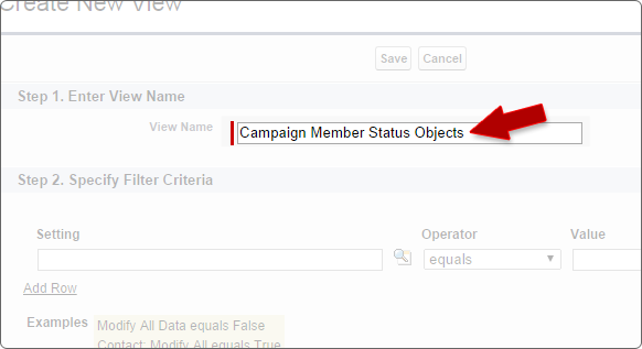 Next give the new list view a name. In this case I will give the view a name related to the objects that I plan on updating.