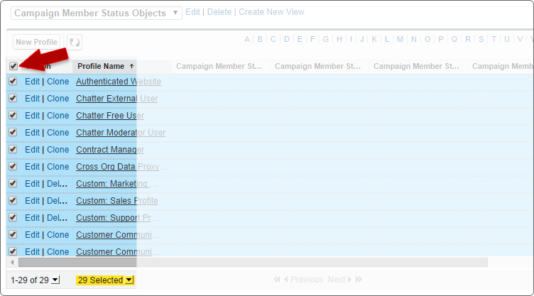 Click the "Save" button to see the list view. Select the checkbox next to each Profile that you want to apply the object setting.