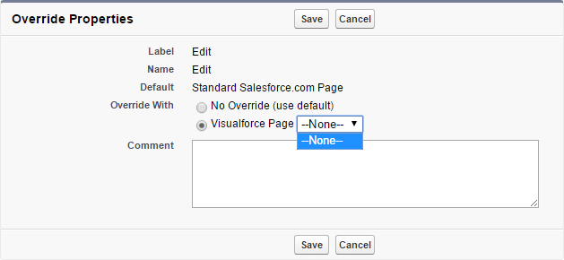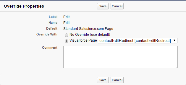 Since we plan on accessing the page from the Account page you may be thinking that we can simply call the Visualforce page as a button/link override. However, we want to use the Contact Edit link for accessing the page so we need to setup the override on the Contact object not the Account object. And since the standard controller for the page is the Account object we simply cannot make the connection.