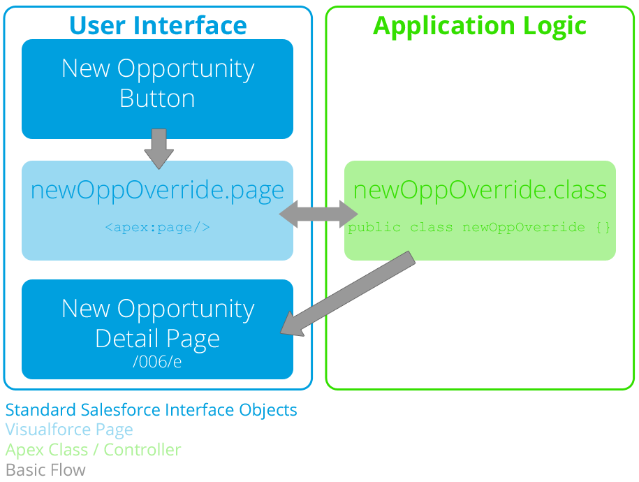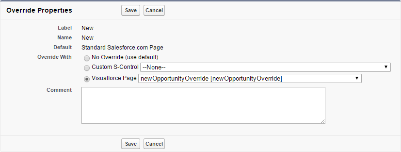 Now that we've got our Visualforce page and Apex class controller we can override the "New" button on the Opportunity object. Navigate to Setup > Customize > Opportunities > Buttons, Links, and Actions. Find the "New" button link in the page and click the "Edit" link. Select the newOpportunityOverride Visualforce page and click the "Save" button.