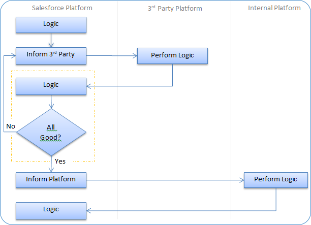 The flows represented inside the yellow outline above signify a single batchable interface where we ultimately determine if it is alright to proceed to the next batchable interface or whether we need to re-process some previous batchable interface.