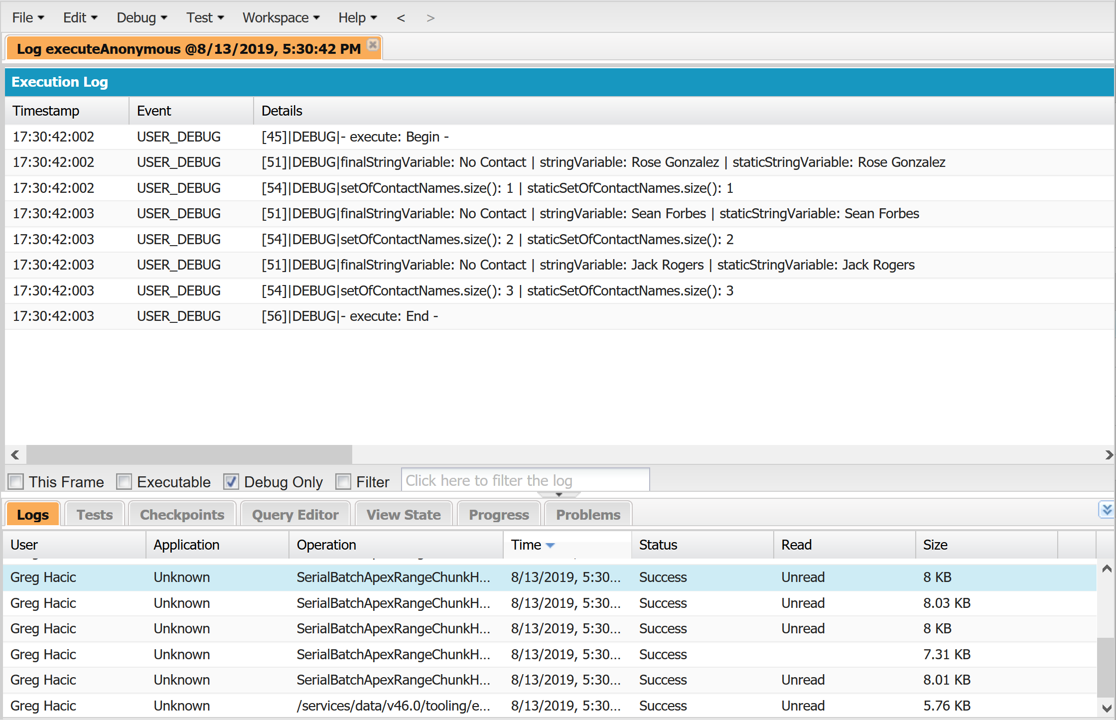 Click the Logs tab located in the bottom section of the developer console. You will see a series of log entries that show the various actions being taken by the batch class. Double click any of the log rows to open them. Then click the checkbox next to the text "Debug Only" to see the debug statements from our Apex class.