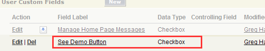 For the purposes of this example I am going to display a button which does a simple alert to users when a check box in their user record is set to true. More specifically, we will create an inline sControl to display on the Contact detail page. This sControl will contain a Salesforce styled button reading "Click Here!" and upon click we will simply show an alert box. Visibility of the button in the sControl will be driven off a new Boolean field on the user record called "See Demo Button" and we will set this up so that when the user has this field flagged as true they will see the button.