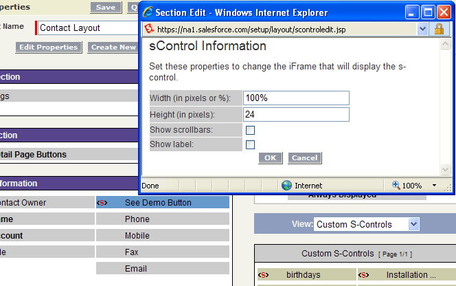 Now that we've got a completed sControl we will need to update our page layout to include it - inline. Setup > App Setup > Customize > Contacts > Page Layouts. Click Edit for the page layout to which you want to add the sControl. Once in the edit screen you can drag the new sControl to the page layout. Be sure to edit the properties of the sControl so that the width is 100%, the height is 24 pixels and the label & scrollbars are not visible.